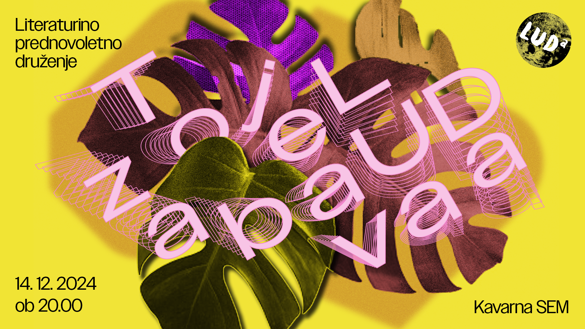Branje nemara res vodi k sedečemu življenjskemu stilu, zato LUD Literatura tudi letos hiti na pomoč s prednovoletno LUDo zabavo. Literaturo, pogovor in ples bomo ob vselej izvrstnem DJ programu Belo smetje prepletali v soboto, 14. decembra, od 20. ure dalje v ljubljanski Kavarni SEM (Metelkova ulica 2).