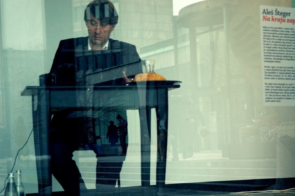 Bolj od glasbene distrakcije je v eksperimentalni knjigi Aleša Štegra zanimivo nekaj drugega: avtor na več mestih poudarja, da se mu je ideja za knjigo porodila aprila letošnjega leta, ko je gledal v razkošno izložbeno okno nekje v Rimu. In v nadaljevanju: »Še enkrat poudarjam, ne glede na to, koliko se vsebina tega, kar pišem, upogiba pod gravitacijo protestov: nikoli in nikdar ne bi načrtoval pisanja na ta način, če bi aprila vedel, da bodo danes protesti. Mislil sem, da bo le konec sveta.« Tudi sicer knjiga postane (predvsem dokumentarno) zanimivejša, ko avtor izstopi iz steklenega zvona na drugo stran in se pomeša med množico protestirajočih. Priprave na demonstracije, ki jih opazuje izza izložbenega okna, postavljanje začasnih ograj, opazovanje naključnih (ali pa tudi ne?) mimoidočih, prihod policistov – čeprav se je vanj prvotno umestil, da bi pričakal konec sveta, mu torej podelijo dramaturgijo teksta.