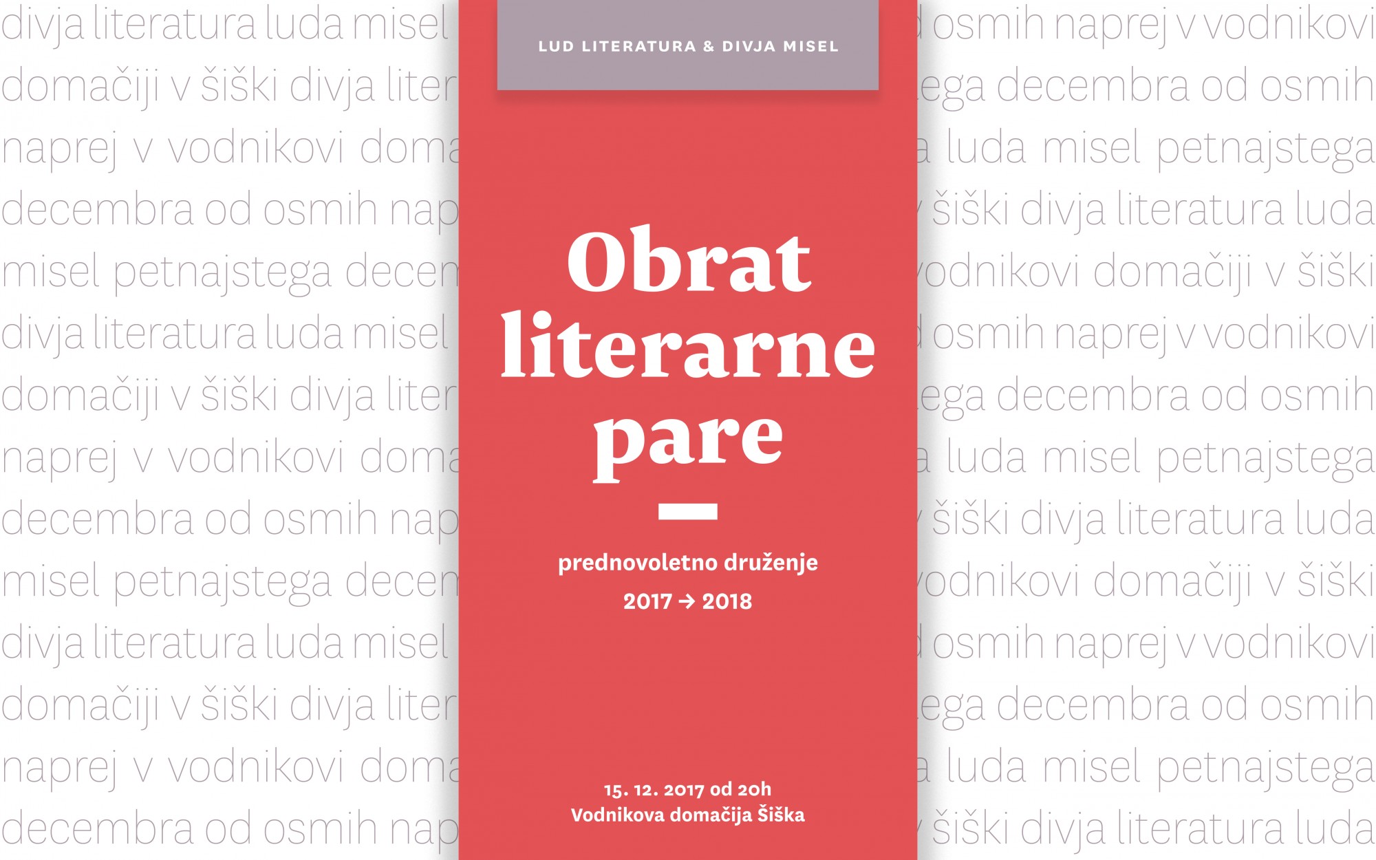 Obrat divja. Para se vije. Leto se obrača. Samo še vrtljaj nas loči do najpomembnejšega dne tega leta. V petek, 15. 12. 2017, bo literarna para nehala sukati pero in od 20h naprej sukala pete v Vodnikovi domačiji v Šiški. Divje misli v divjih telesih bodo spodbujali Belo smetje, DJ Pascual in Cimermanja. Podmazali bomo tudi surove jezike. Vljudno vabljeni na prednovoletno druženje, ki ga skupaj organizirata LUD Literatura in Divja misel (Vodnikova domačija Šiška). Para se bo vila od pritličja do podstrehe. Zaloga razlogov za druženje se ne bo izčrpala, količine drugih oblik podpore pa so omejene.
